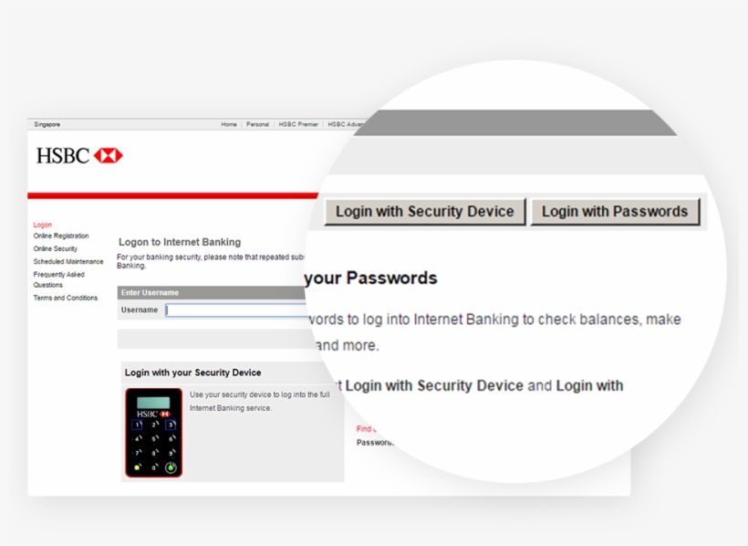 HSBC understand that your time is important therefore HSBC Internet Banking provides convenience on managing your financial necessity with features that can help you to manage your investment execute banking transactions and access your HSBC account worldwide in one screen. Use your security device to log into the full Internet Banking service. Login with your passwords Use your passwords to log into secure Internet Banking with some services restricted.