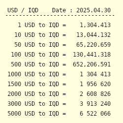 16-04-2021 133606 Exchange Rates USD - US Dollar for IQD - Iraqi Dinar. Select a time frame for the chart. Moreover we added the list of the most popular conversions for visualization and the history table with exchange rate diagram for 1 US Dollar USD to Iraqi Dinar.